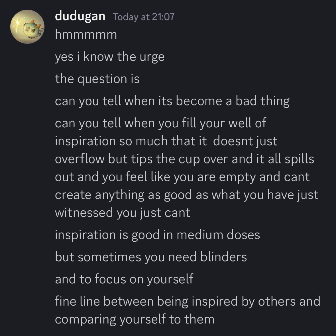 i am a creature of inspiration. every time i consume a piece of media i find impactful, i immediately have an intense urge to go create something like it.