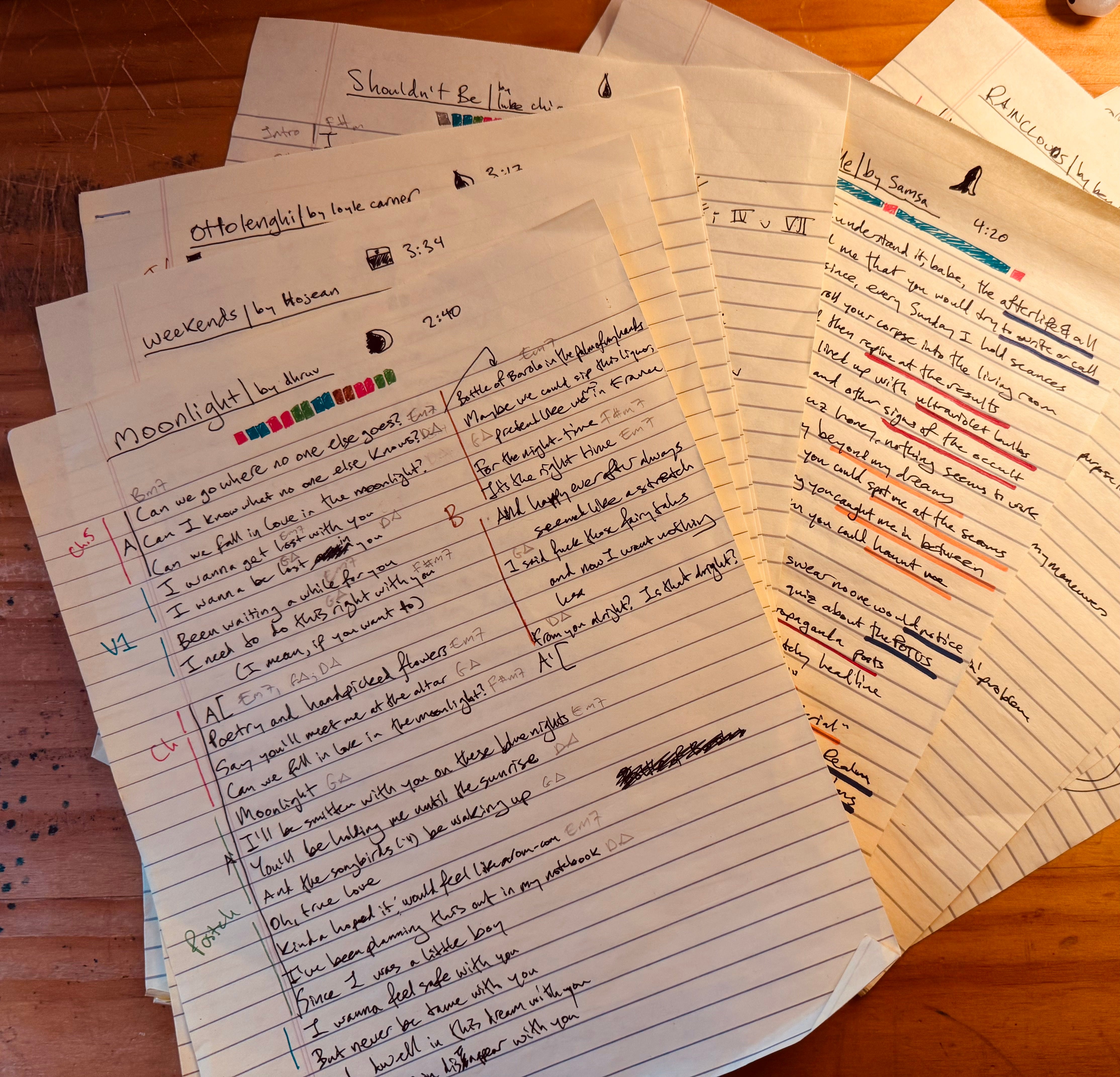 almost every day for the past two weeks, i’ve analyzed a song i like, each time by a different artist i vibe with. i write out each line of the lyrics, each chord, the song structure and instrumentation, and record myself humming the melody. i do this all (except of course the last part) on my yellow notepad, and it’s very therapeutic. it gets me really inspired, because i don’t think i realize often enough how brilliant the lyrics of some songs are. the hope is also that over time i internalize how these songs work, and can later create songs of my own more intuitively. this is a really nice kind of inspiration - a motivating force.